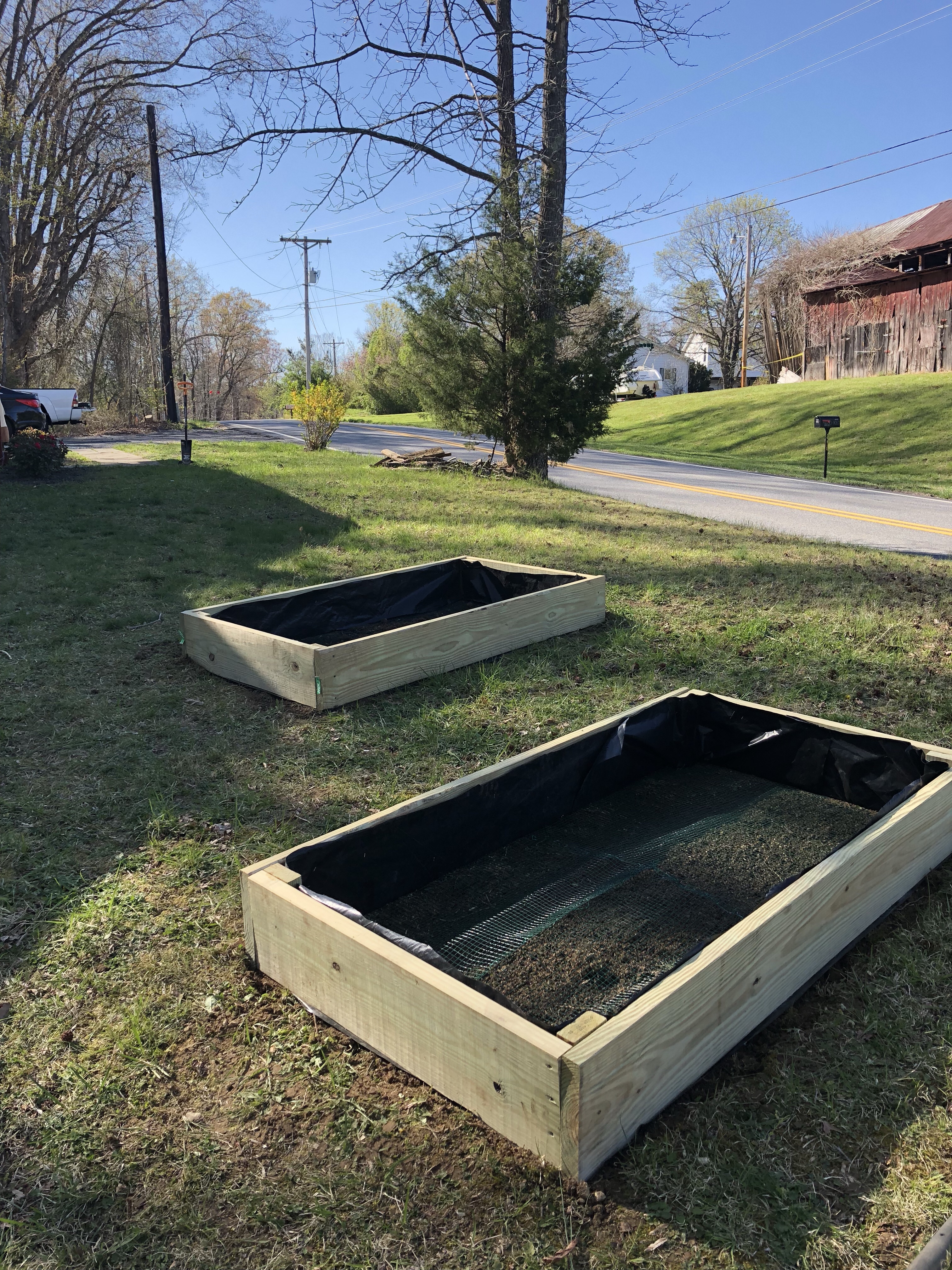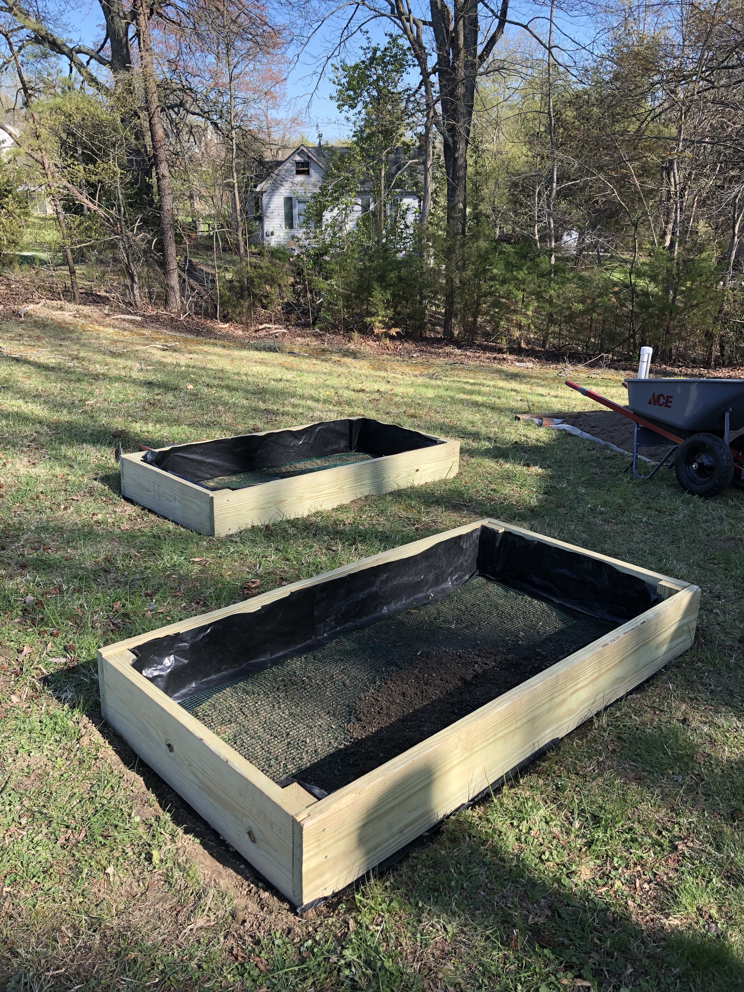 We chose pressure treated 1x12s to build up our raised beds. We ideally would have liked cedar wood, but it is very hard to come by where we live. So we lined the wood with 6mil plastic to prevent the soil from touching as well as we enclosed the bottoms with chicken wire to prevent moles from digging up into our gardens.