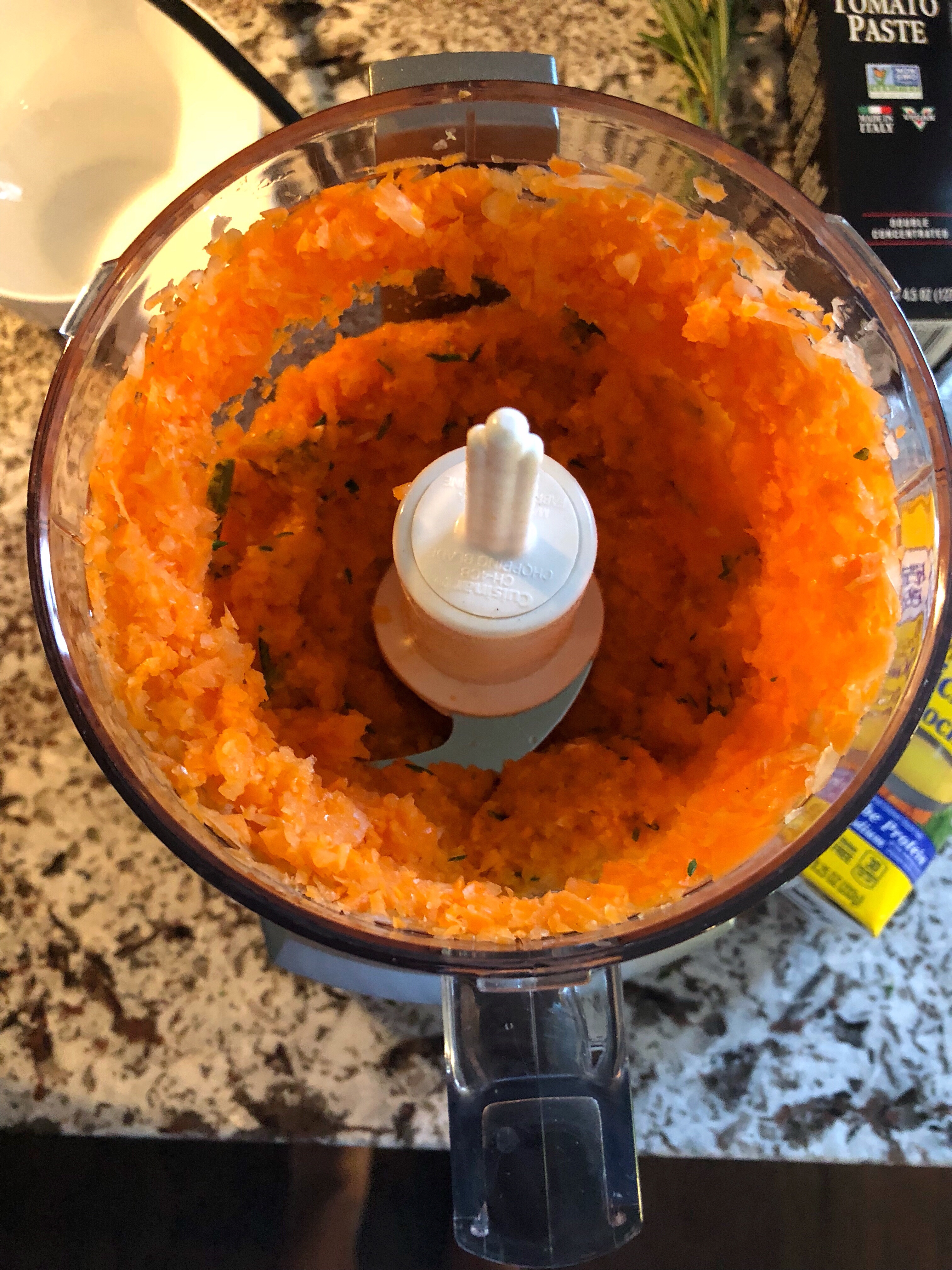 3. In a food processor or chopper. Chop together the carrots, onions, garlic, rosemary leaves, and thyme leaves. Be sure the consistency is close to a rough paste.