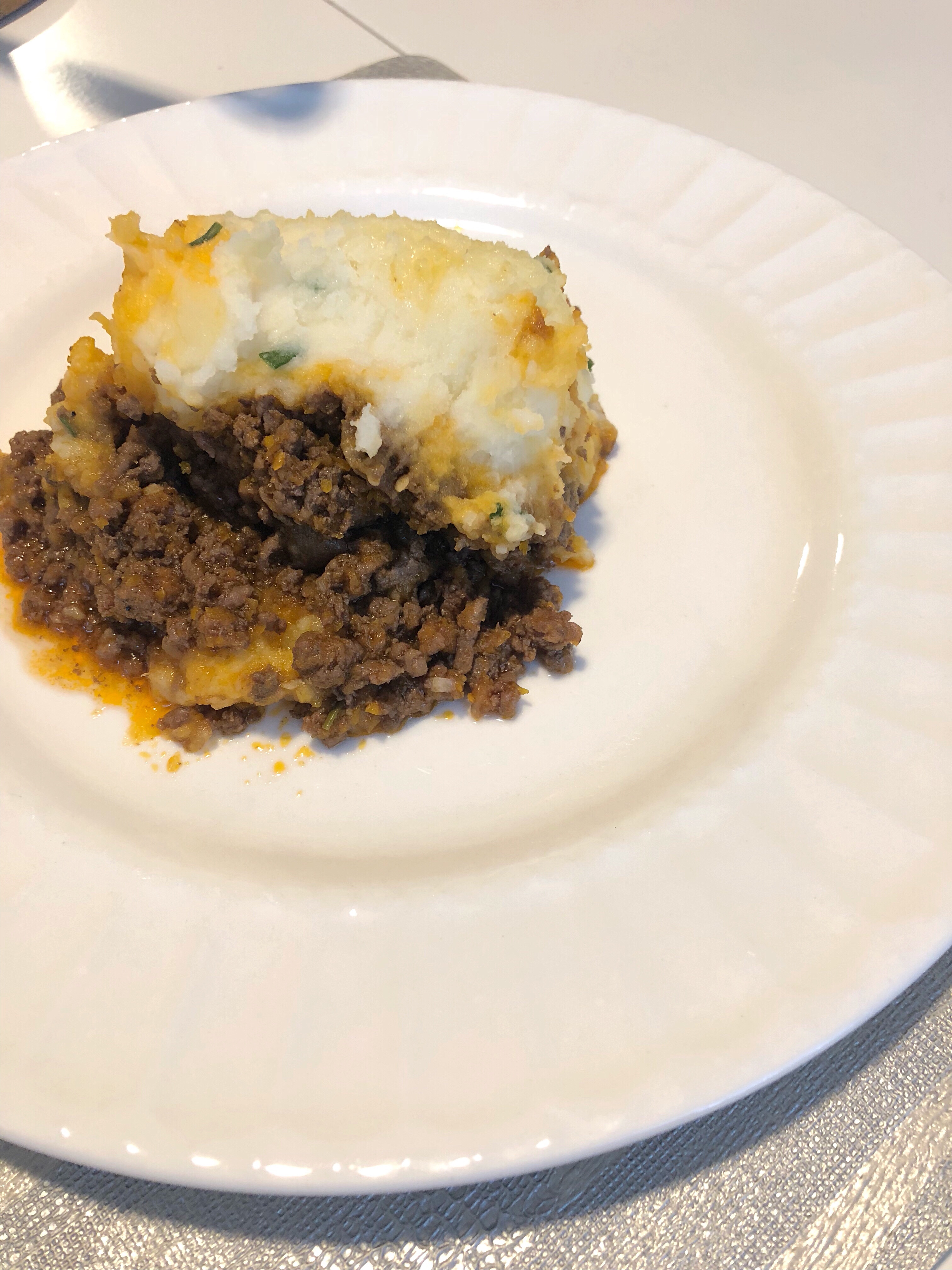 7. Once the sauce is reduced. Transfer to a large dish. Top with the mashed potatoes. Be sure to rough up the potatoes with a fork. Bake at 350° for 20 minutes. Serve immediately.
