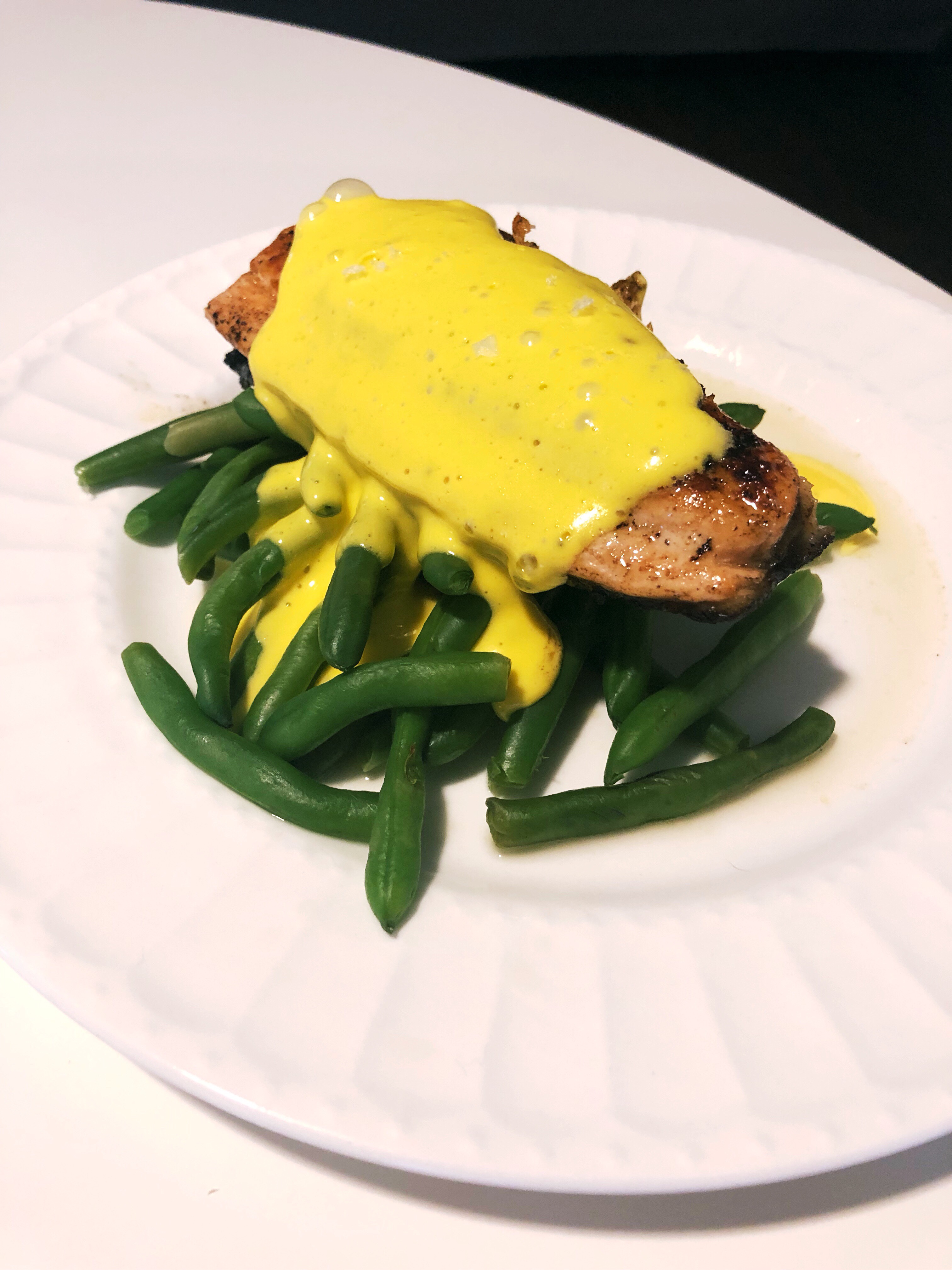 Once the salmon is done, assemble the dish with the green beans on the bottom, topped with the salmon, and covered with the hollandaise sauce